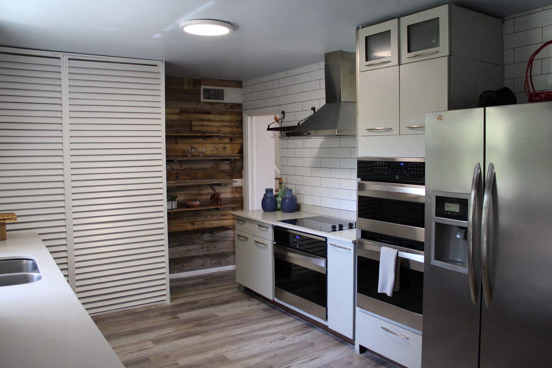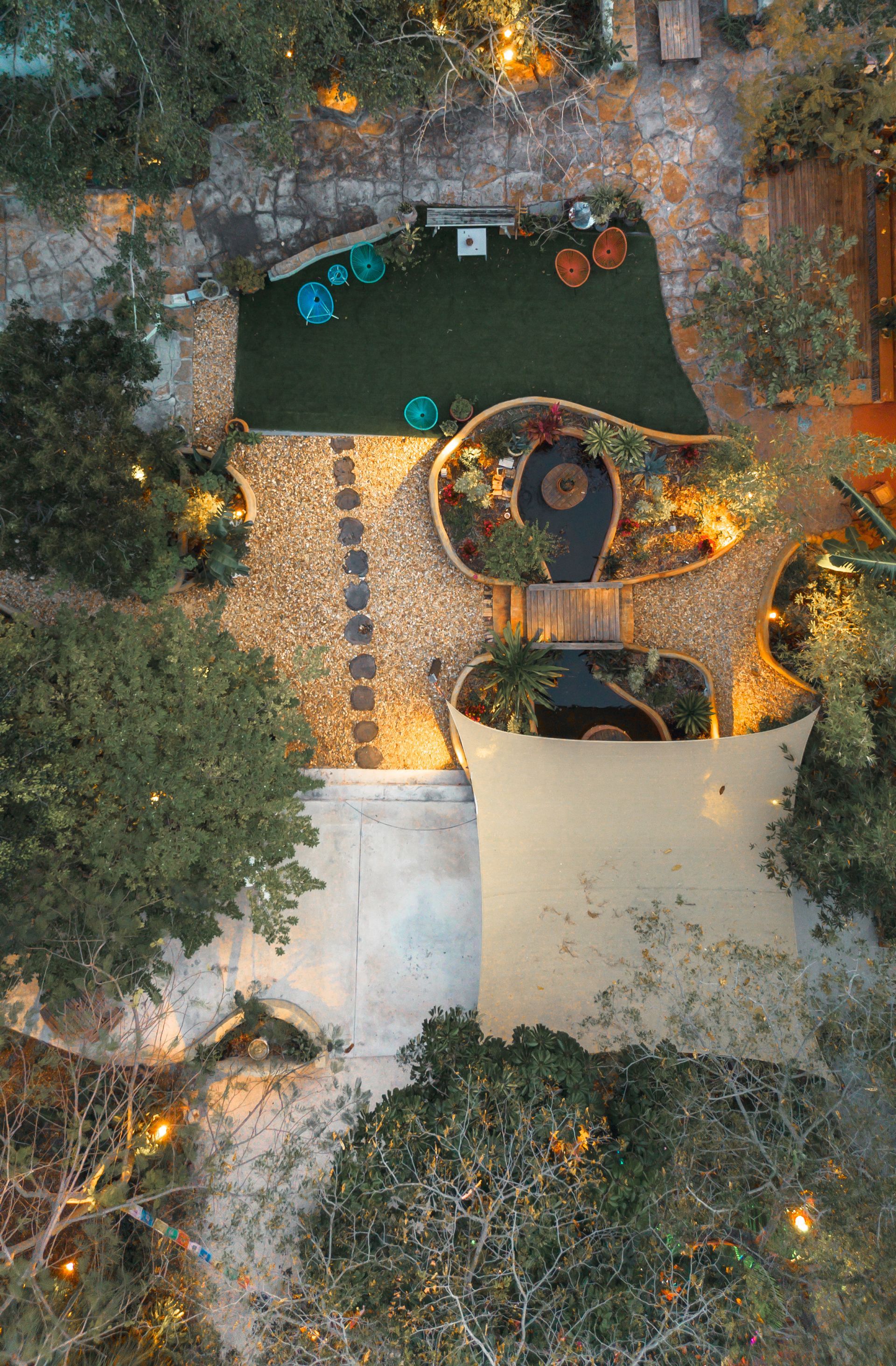 Garden View, backyard space that includes a fire pit, outdoor kitchen, dining area, and furniture and bikes.